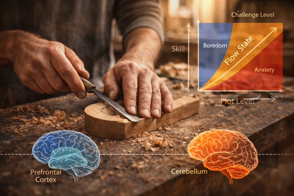 Structured handcraft is particularly effective at inducing flow because it requires sustained attention, fine motor coordination, and real-time problem solving. When carving, for example, the brain tracks grain direction, pressure modulation, and micro-adjustments. This level of engagement narrows attentional bandwidth to the task at hand.
